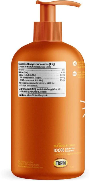 - Zesty Paws Pure Salmon Oil Skin & Coat Support Dog & Cat Supplement makes for a great food topping on regular meals with a delicious flavor that all pets will go wild for.