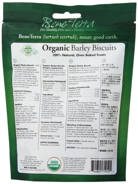Feed your small pet treats made from the same foods he’d find in nature with Oxbow Bene Terra Organic Barley Biscuits Small Animal Treats. Treats are a great way to bond with your pet and encourage consistent behaviors. And because they should not exceed 5 percent of your pet’s diet, providing healthy treats that satisfy their natural tastes is important. Oxbow Bene Terra Organic Barley Biscuits Small Animal Treats are made with organic hay, an essential part of your small pet’s diet, fruits and vegetables produced by certified organic farmers. All that goodness is oven-baked into wholesome, crunchy treats that also satisfies their instinct to chew.