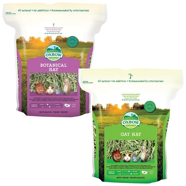 Offer your small pet variety and stimulate his appetite for hay with this Oxbow Botanical Hay + Oat Hay Small Animal Food bundle! Some small pets like guinea pigs, rabbits and chinchillas, need a daily supply of hay for digestion, to satisfy their need to chew, to keep their teeth trim and for environmental enrichment that mimics their natural environment. In fact, hay should make up 75% of their diet. Oxbow Botanical Hay Small Animal Food is a rich blend of herbs like chamomile and lavender with Western timothy hay that is hand selected, hand packed and quality assured. Alternate Oxbow Botanical Hay Small Animal Food with other Oxbow grass hays or mix it in with other hays to create appetizing, long-strand fiber meals. The Oxbow Oat Hay Small Animal Food is high in fiber, low in protein and full of flavor, making it ideal for adult small pets. Feed unlimited amounts as an alternative to timothy, orchard and organic meadow hay.