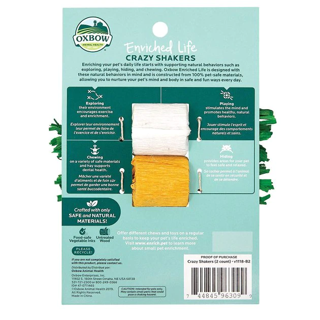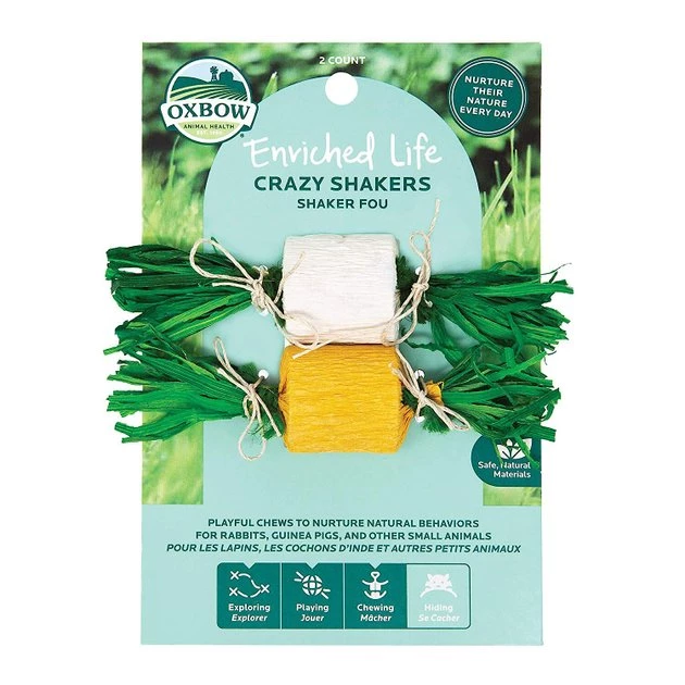 Give the Oxbow Crazy Shakers Small Animal Chew Toy a little shake and watch your four-legged friend scurry over with curiosity. These 100% pet-safe toys help enrich your guinea pig’s life with interactive play that’s meant to excite and engage. Each shaker is totally chewable and is made of a variety of fun textures that are bound to keep your best bud interested for nibble after nibble. Help nurture your small sidekick’s mind and body through an instinctual accessory that encourages tons of squealing delight. The Crazy Shakers are also great for your rabbit or other small animal.