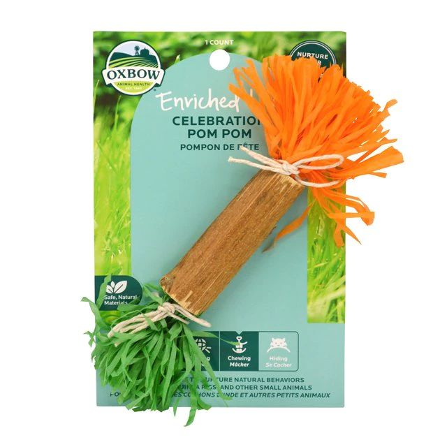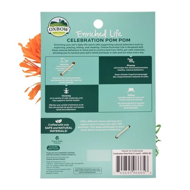Cheer on your cuddly companion with the Oxbow Enriched Life Celebration Pom Pom Small Animal Toy. This guinea pig and rabbit chew toy is the paw-fect way to celebrate your cuddly companion’s birthday and other special occasions. It is designed to support his natural chewing and playing behaviors while encouraging mental and physical enrichment. This small pet chew toy is an ideal way to strengthen the bond that you have with your fuzzy buddy and is crafted using high-quality, 100% pet-safe materials.