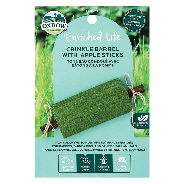 Your four-legged friend will nibble and gnaw with joy with the Oxbow Crinkle Barrel with Apple Sticks Small Animal Chew Toy. This 100% pet-safe toy helps enrich your guinea pig’s life with interactive play that’s meant to excite and engage. The apple stick is covered in a chewable barrel that makes an irresistible sound, providing an adventure that goes beyond your small sidekick’s love of paw-fectly munchable textures. Help nurture your small sidekick’s mind and body through an instinctual accessory that encourages tons of squealing delight. The Crinkle Barrel is also great for your rabbit or other small animal.