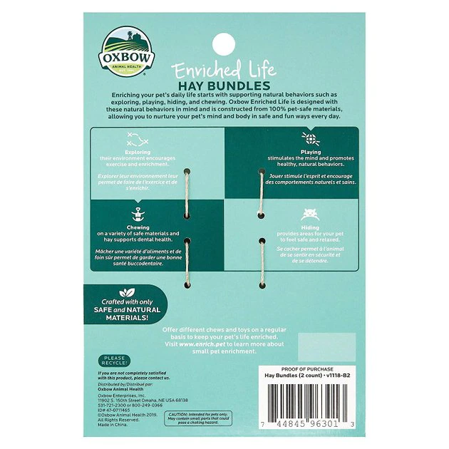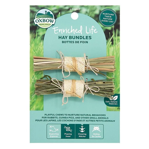 - A neatly tied bundle of hay—made with a mixture of interesting textures for hours of engaging chew time.