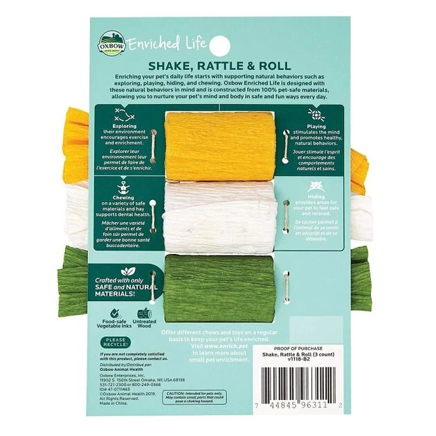 Oxbow Shake, Rattle & Roll Small Animal Chew Toy allows your guinea pig to have munchable fun in more ways than one! This 100% pet-safe toy helps enrich your guinea pig’s life with interactive play that’s meant to excite and engage. Each rollable shaker is the ideal size for your small sidekick and comes in a chewable casing that’ll bring your best bud tons of munchable fun. Help nurture your pet’s mind and body through an instinctual accessory that encourages tons of squealing delight. The Shake, Rattle & Roll set of chew toys is also great for your rabbit or other small animal.