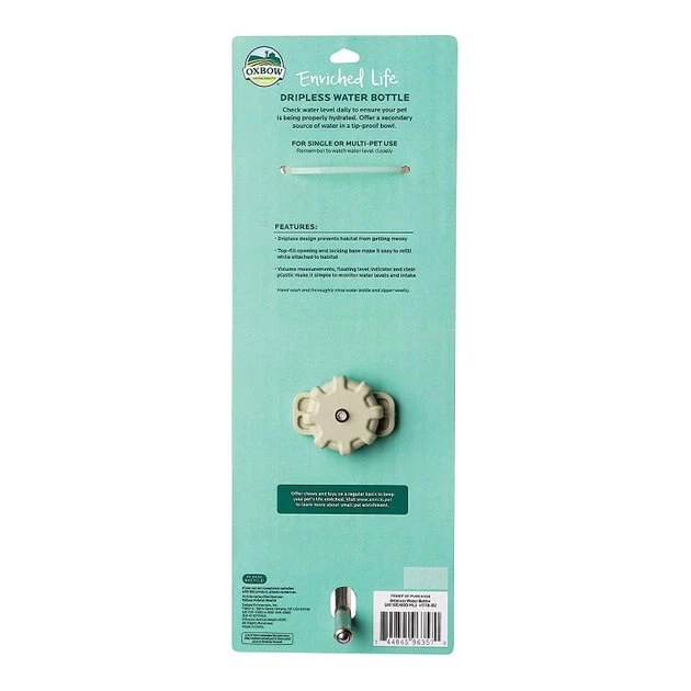 Keep your four-legged friend hydrated and healthy with the Oxbow Dripless Small Animal Water Bottle. This pet-safe bottle is made to be dripless to ensure your best bud’s habitat stays dry. Measure correctly with the volume ticks then fill the bottle up from the top and simply lock the base. A floating level indicator and clear design allow you to see exactly how much water your guinea pig, rabbit or other small animal is drinking.