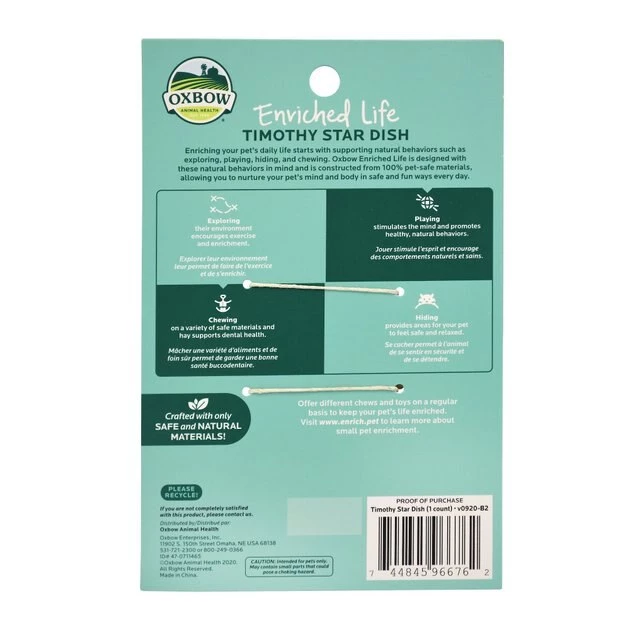 Keep your sidekick feeling satisfied with the Oxbow Enriched Life Timothy Star Dish Small Animal Toy. This guinea pig and rabbit chew toy features a fun design that can also accommodate additional hay and treats for your pet pal. It is the paw-fect way to help strengthen the bond that you have with your cuddly companion while encouraging his natural instincts to chew and play. This small pet chew toy is crafted using high-fiber timothy hay and enticing marigold that are 100% pet-safe for the health and happiness of your fuzzy fellow.