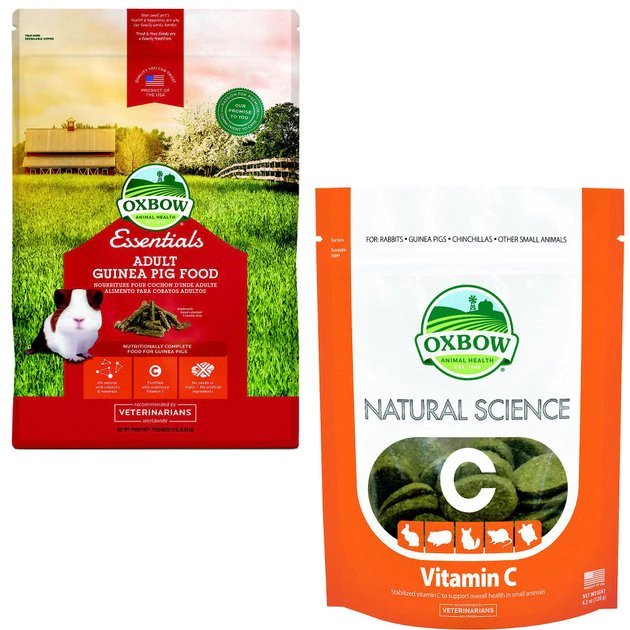 This Oxbow Essentials Adult Guinea Pig Food All Natural Adult Guinea Pig Pellets + Natural Science Vitamin C Small Animal Supplement bundle is paw-fect for your little furry buddy. The Essentials Adult Guinea Pig food combines essential fiber and stabilized nutrients. It is specifically designed to meet the nutritional needs of guinea pigs over six months. It contains stabilized Vitamin C and an optimal calcium-to-phosphorous ratio for overall health. Feed 1/8 cup pellets daily in addition to unlimited grass hay. Like humans, Guinea Pigs cannot produce vitamin C on their own and rely on their diet for this essential vitamin. The Oxbow Natural Science Vitamin C Small Animal Supplement is a hay-based, high-fiber supplement containing the essential stabilized vitamin C guinea pigs need to stay healthy. Other small pets can benefit from this supplement during times of stress, illness or recovery. It also contains timothy grass, barley flour and oat grout flour for fiber and flaxseed meal for protein.
