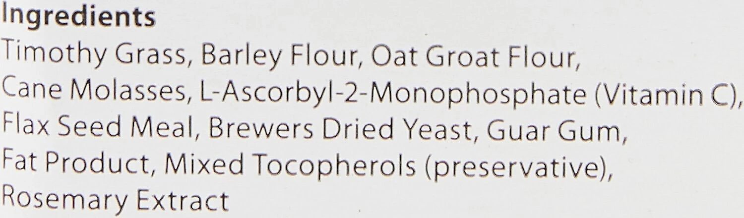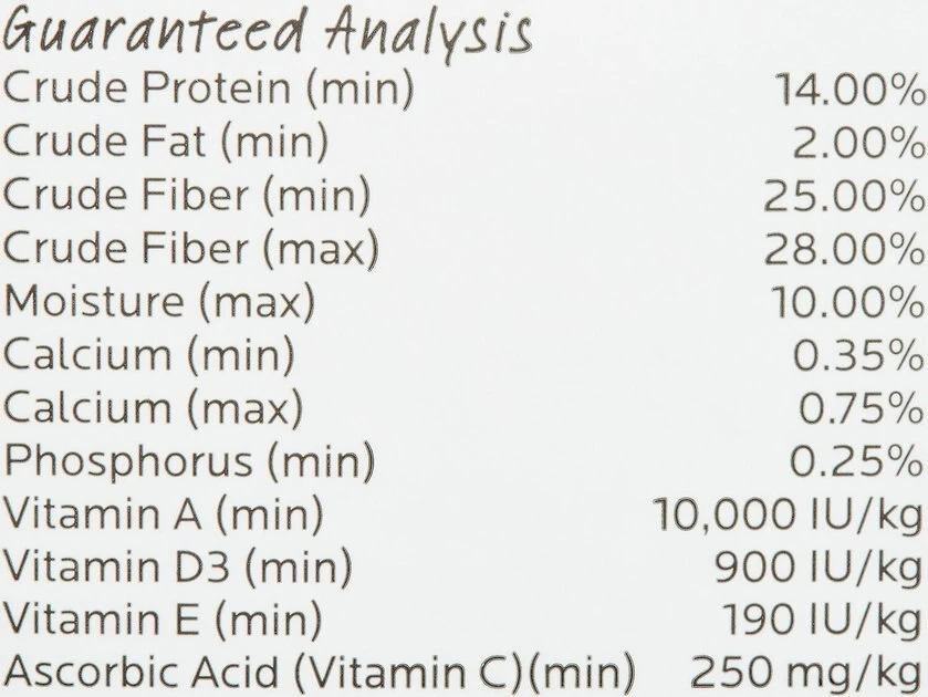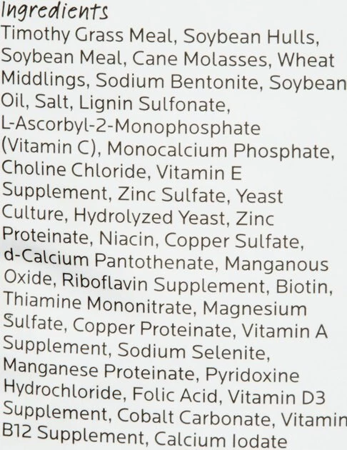 - Includes high-fiber grass hay that promotes healthy gastrointestinal health. Contains lower levels of protein, calories and calcium than alfalfa-based pellets.