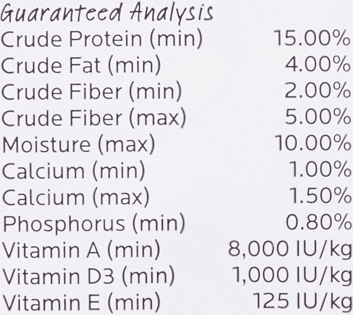 Whole Brown Rice, Oat Groats, Wheat Bran, Wheat, Soybean Meal, Menhaden Fish Meal, Calcium Carbonate, Natural Flavor, Soybean Hulls, Brewer’s Dried Yeast, Flax Seed Meal, Monocalcium Phosphate, DL-Methionine, Canola Oil, Hydrolyzed Yeast, Wheat Germ Meal, Yucca Schidigera Extract, Salt, Inulin, Magnesium Oxide, Mixed Tocopherols (preservative), Choline Chloride, Sodium Bentonite, Vitamin E Supplement, Zinc Oxide, Manganous Oxide, L-Ascorbyl-2-Monophosphate (Vitamin C), Niacin, Copper Sulfate, Zinc Proteinate, Biotin, d-Calcium Pantothenate, Copper Proteinate, Manganese Proteinate, Riboflavin Supplement, Vitamin A Supplement, Pyridoxine Hydrochloride, Sodium Selenite, Thiamine Mononitrate, Menadione Sodium Bisulfite Complex (Vitamin K), Vitamin B12 Supplement, Vitamin D3 Supplement, Folic Acid, Calcium Iodate, Cobalt Carbonate, Rosemary Extract.