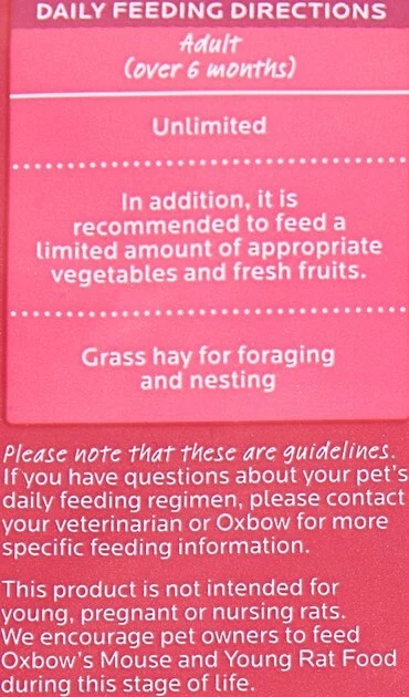 Feed your adult rat a low-fat diet and prevent life-threatening obesity with Oxbow Essentials Regal Rat Adult Rat Food. Adult rats four months and older have different nutritional needs than when they were in growing stages. Because they are less active, they don’t require the same levels of certain nutrients and fat. Foods high in fat can result in obesity and other health issues. Oxbow Essentials Regal Rat Adult Rat Food is designed meet your pet’s adult nutritional needs and increase their longevity. It contains brown rice, a low-calorie energy source, oats and wheat for fiber and soy and fish meal, protein sources with healthy fats. Feed an unlimited supply to adults that have healthy weights and combine with grass hay to encourage foraging.
