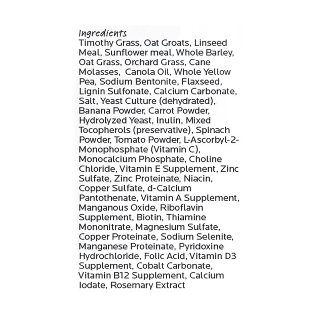 Timothy Grass, Oat Groats, Linseed Meal, Sunflower Meal, Whole Barley, Oat Grass, Orchard Grass, Cane Molasses, Canola Oil, Whole Yellow Pea, Sodium Bentonite, Flaxseed, Lignin Sulfonate, Calcium Carbonate, Salt, Yeast Culture (Dehydrated), Banana Powder, Carrot Powder, Hydrolyzed Yeast, Inulin, Mixed Tocopherols (Preservative), Spinach Powder, Tomato Powder, L-Ascorbyl-2-Monophosphate (Vitamin C), Monocalcium Phosphate, Choline Chloride, Vitamin E Supplement, Zinc Sulfate, Zinc Proteinate, Niacin, Copper Sulfate, D-Calcium Pantothenate, Vitamin A Supplement, Manganous Oxide, Riboflavin Supplement, Biotin, Thiamine Mononitrate, Magnesium Sulfate, Copper Proteinate, Sodium Selenite, Manganese Proteinate, Pyridoxine Hydrochloride, Folic Acid, Vitamin D3 Supplement, Cobalt Carbonate, Vitamin B12 Supplement, Calcium Iodate, Rosemary Extract.