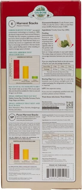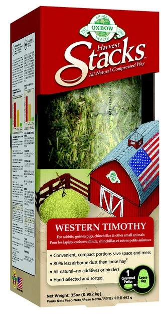 Provide your small pet all of the benefits of hay without the dust and scatter of loose hay with Oxbow Harvest Stacks Compressed Hay Western Timothy Small Animal Food. Some small pets like Guinea Pigs, rabbits and chinchillas, need hay to maintain a healthy digestive process. In fact, hay should make up 75 percent of their diet. Oxbow Harvest Stacks Compressed Hay Western Timothy Small Animal Food is 100 percent all-natural, long-strand, hand-sorted Western timothy hay compressed into compact, convenient-to-feed portions. It has the same nutritional benefits of loose hay, but produces 80 percent less dust and is ideal for traveling or limited storage spaces. Feed as a primary hay source or supplement with loose hay to encourage enrichment.