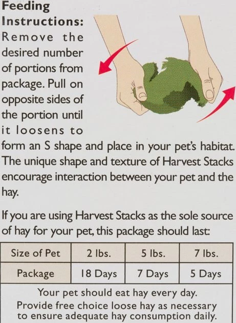 Remove the desired number of portions from package. Pull on opposite sides of the portion until it loosens to form an S shape and place in your pet’s habitat. The unique shape and texture of Harvest Stacks encourage interaction between your pet and the hay.