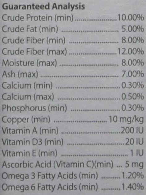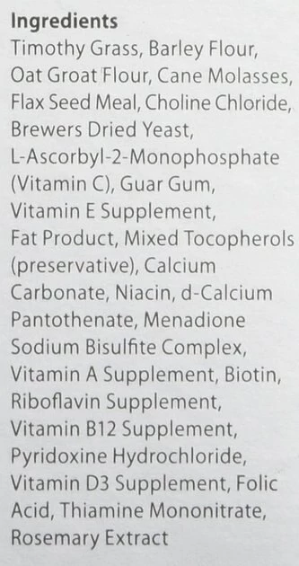 Timothy Grass, Barley Flour, Oat Groat Flour, Cane Molasses, Flax Seed Meal, Choline Chloride, Brewers Dried Yeast, L-Ascorbyl-2-Monophosphate (Vitamin C), Guar Gum, Fat Product, Mixed Tocopherols (Preservative), Calcium Carbonate, Niacin, D-Calcium Pantothenate, Menadione Sodium Bisulfite Complex, Vitamin A Supplement, Biotin, Riboflavin Supplement, Vitamin B12 Supplement, Pyridoxine Hydrochloride, Vitamin D3 Supplement, Folic Acid, Thiamine Mononitrate, Rosemary Extract.