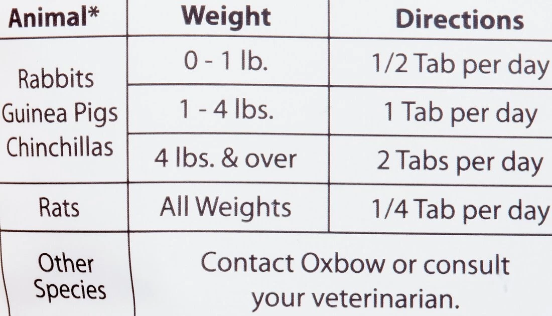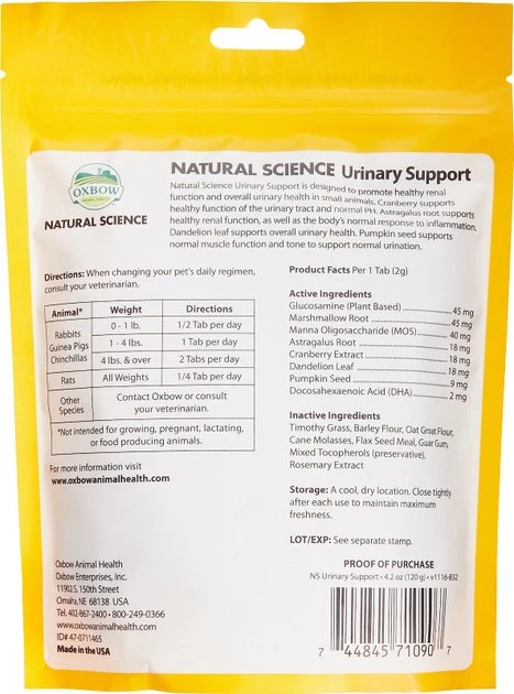 Support your small pet’s overall urinary health with Oxbow Natural Science Urinary Support Small Animal Supplement. Small pets including Guinea Pigs, rabbits, hamsters, gerbils and chinchillas are living longer because of better care and nutrition. As they age, the most common ailments reported are related to digestive, urinary, joint and skin and coat issues. Oxbow Natural Science Urinary Support Small Animal Supplement is a high-fiber supplement contains various beneficial ingredients including cranberry and dandelion leaf for urinary health and astragalus root to support healthy kidney function. Depending on weight, feed rabbits, Guinea Pigs and chinchillas ½ to 2 tabs a day, rats ¼ tab a day and hamsters and gerbils 1/8 tab. It is not recommended for mice.