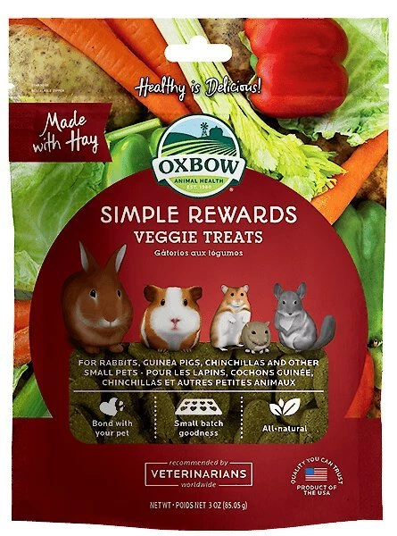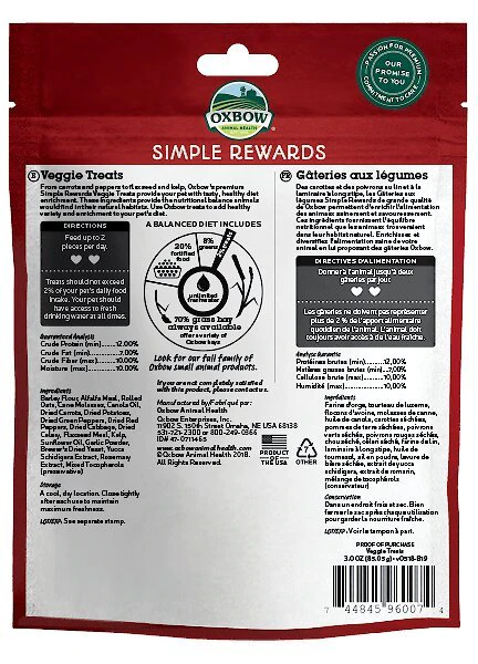 Reward your small pet and support his overall health with Oxbow Simple Rewards Oven Baked Veggie Small Animal Treats. Treats are a great way to bond with your pet, encourage interaction and provide healthy, fun mental stimulation. Oxbow Simple Rewards Oven Baked Veggie Small Animal Treats are a wholesome, oven-baked blend of vegetables and greens that provide a tasty, enriching snack. They are low in calcium and protein with a balanced protein-to-fiber ratio and no artificial color or preservatives. Feed one-to-two treat pieces a day. Treats should not exceed five percent of your pet’s daily food intake.