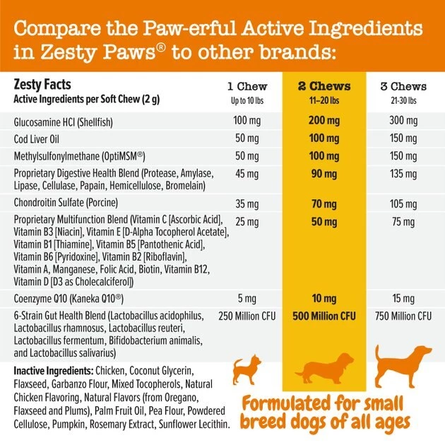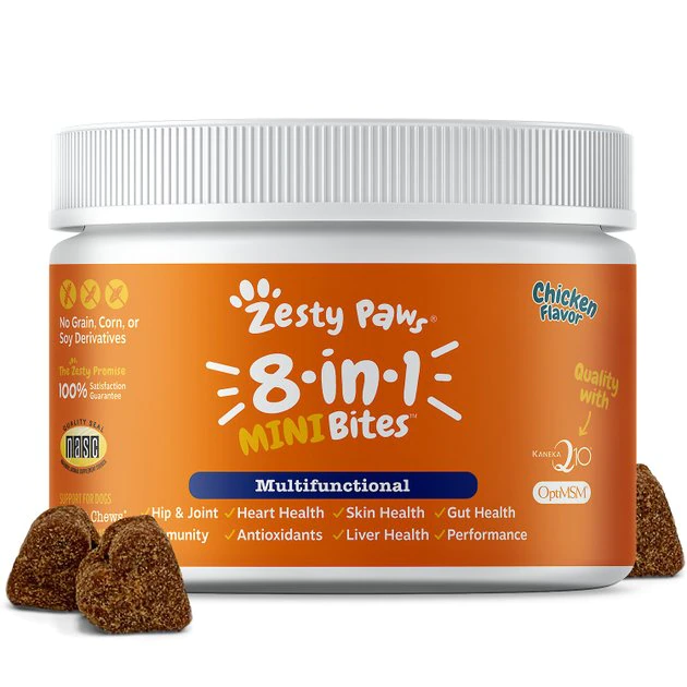Zesty Paws 8-in-1 Chicken Flavored Mini Soft Chew Multivitamin Dog Supplement premium soft chews that provide eight great multifunctional benefits for your dog’s overall support. These functional supplements support hip and joint function, heart health, skin health, gut function, the immune system, antioxidant activity, liver health, and performance for small adult and senior dogs. That’s because this chewable functional supplement contains Glucosamine, Chondroitin, a Gut Health Blend (including Lactobacillus acidophilus), a Digestive Health Blend, and a whole lot more! Best of all, these mini doggie chewables taste delicious and pet parents can let out a sigh of relief knowing that their canine companions will get the multi functional support to keep them feeling zesty and happy!