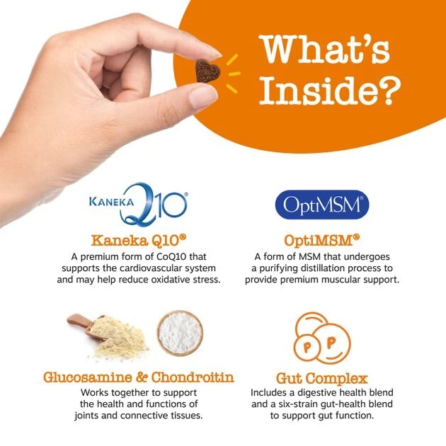Glucosamine HCl (Shellfish), Cod Liver Oil, Methylsulfonylmethane (OptiMSM), Proprietary Digestive Health Blend (Protease, Amylase, Lipase, Cellulase, Papain, Hemicellulose, Bromelain), Chondroitin Sulfate (Porcine), Proprietary Multifunction Blend (Vitamin C [Ascorbic Acid], Vitamin B3 [Niacin], Vitamin E [D-Alpha Tocopherol Acetate], Vitamin B1 [Thiamine], Vitamin B5 [Pantothenic Acid], Vitamin B6 [Pyridoxine], Vitamin B2 [Riboflavin], Vitamin A, Manganese, Folic Acid, Biotin, Vitamin B12, Vitamin D [D3 as Cholecalciferol]), Kaneka Q10 (Coenzyme Q10), 6-Strain Gut Health Blend (Lactobacillus acidophilus, Lactobacillus rhamnosus, Lactobacillus reuteri, Lactobacillus fermentum, Bifidobacterium animalis, Lactobacillus salivarius), Chicken, Coconut Glycerin, Flaxseed, Garbanzo Flour, Mixed Tocopherols, Natural Chicken Flavoring, Natural Flavors (from Oregano, Flaxseed and Plums), Palm Fruit Oil, Pea Flour, Powdered Cellulose, Pumpkin, Rosemary Extract, Sunflower Lecithin.