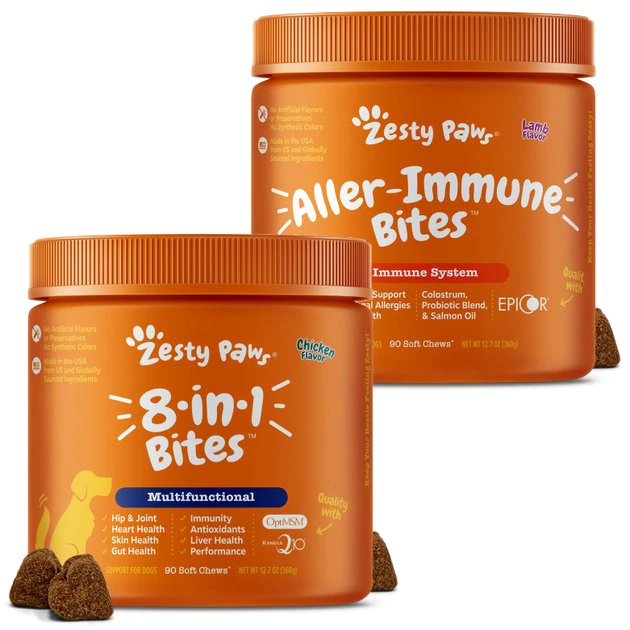 At Zesty Paws, we know that pet parents worry about giving their pet the best care and protection. With the Zesty Paws 8-in-1 Multivitamin Bites + Aller-Immune Bites Lamb Flavor Immune System Soft Chews Dog Supplement, you can tackle multiple issues at once. The 8-in-1 Bites provide eight great multifunctional benefits for your dog’s overall support, including hip and joint function, heart and liver health, and immune support for adult or even senior dogs of all types. The Aller-Immune soft chew formula provides seasonal allergy support, along with supporting the immune system, skin health, and normal gut flora for canine pets, no matter the breed and for all ages. The delicious flavors mean that Fido will happily accept them, and you can both enjoy an allergy free day.