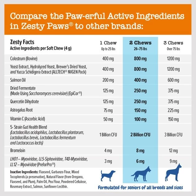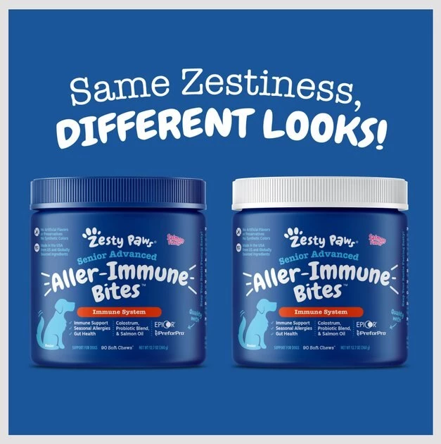 It’s the dogs we love the longest that we love the most, so we want to look after them in every way. Senior Advanced Aller-Immune Bites offers extra TLC for your furry friend – whether they’re a senior or adult or small, medium, or large! These functional supplements support immune function and help dogs with normal seasonal allergies and may even help maintain histamine levels. So, help your canine get the relief and support she’s craving with Zesty Paws! These tasty pet soft chews contain EpiCor, PreforPro (Prebiotic), Colostrum, Omega-3 Salmon Oil, and Probiotics. Together, the ingredients in this functional pet supplement support dogs with seasonal allergies along with supporting immune, skin, and gut health.