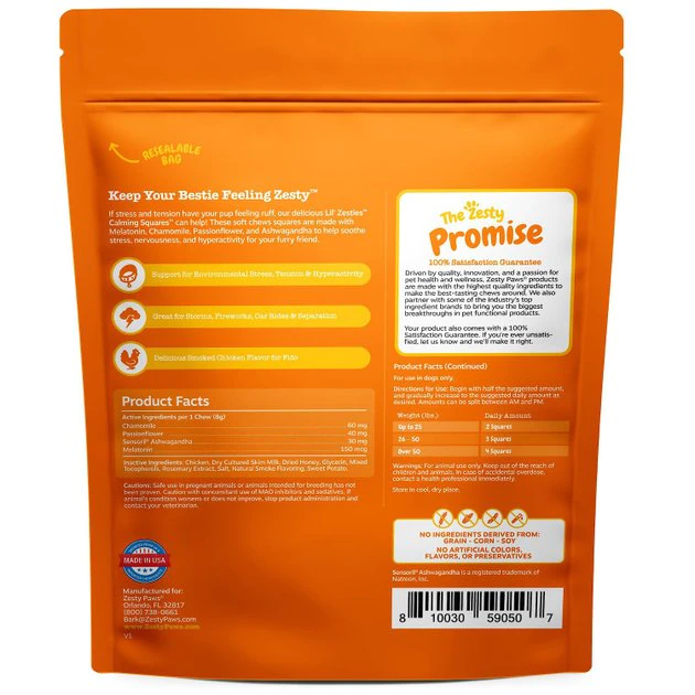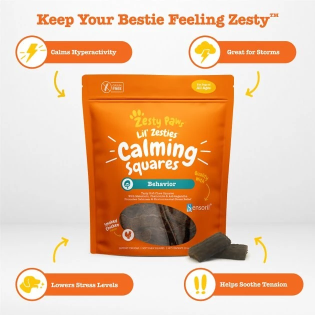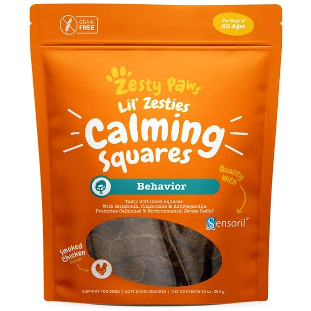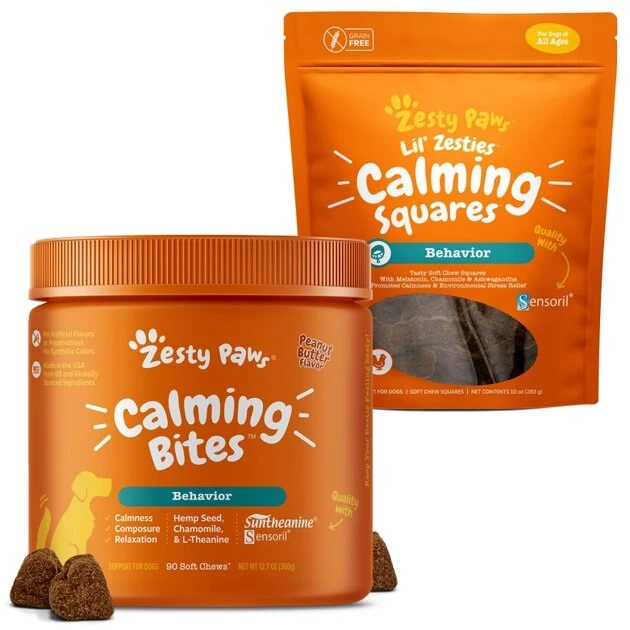 You know how it impacts your overall sense of wellbeing when you’re anxious or stressed, and the same is true for your dog. Zesty Paws All Ages, Calming Bites, Peanut Butter Flavored Soft Chews, Behavior Functional Dog Supplement, and Zesty Paws Lil’ Zesties Calming Squares Smoked Chicken Flavor Behavior Support Soft Chews Dog Supplement bundle provide safe and effective ways for you to help manage your canine companion’s emotional health. Zesty Paws All Ages, Calming Bites, Peanut Butter Flavored Soft Chews, Behavior Functional Dog Supplement are soft chews that are formulated to help support stressed, nervous and hyperactive dogs. Packed with ingredients like chamomile, valerian root, L-tryptophan and sensoril ashagawandha, these supplements may additionally work to help her focus. They also contain suntheanine, an amino acid that helps promote a sense of relaxation and calmness, during events like thunderstorms or fireworks. If your dog is in the mood for poultry instead of peanut butter, the Zesty Paws Lil’ Zesties Calming Squares Smoked Chicken Flavor Behavior Support Soft Chews Dog Supplement may be the answer in giving him a sense of peace. Each soft chew square includes melatonin and passionflower to help soothe his nerves. These chews are an effective way to support your dog during events like car rides. Free of wheat, soy, gluten or preservatives, the smoked chicken flavor makes for a taste your dog is sure to love. This bundle can help your dog be cool, calm and collected.