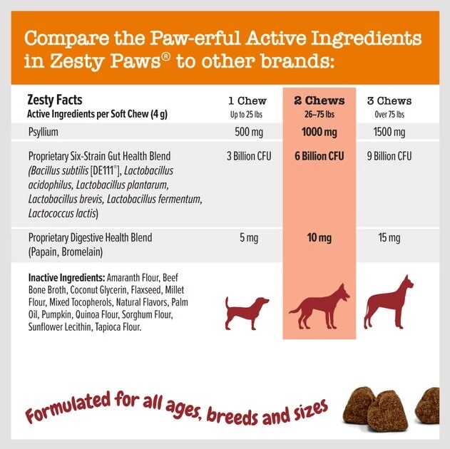 Psyllium, Proprietary Six-Strain Gut Health Blend (Bacillus subtilis [DE111], Lactobacillus acidophilus, Lactobacillus plantarum, Lactobacillus brevis, Lactobacillus fermentum, and Lactobacillus lactis), Proprietary Digestive Health Blend (Papain, Bromelain), Amaranth Flour, Beef Bone Broth, Coconut Glycerin, Flaxseed, Millet Flour, Mixed Tocopherols, Natural Flavors, Pumpkin, Palm Oil, Quinoa Flour, Sorghum Flour, Sunflower Lecithin, Tapioca Flour.