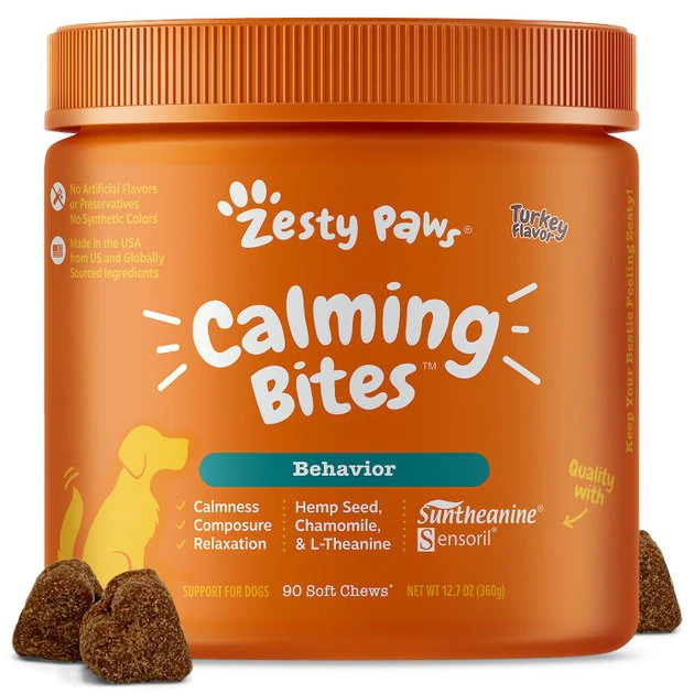 Zesty Paws Calming Bites are premium chewables that may help dogs with normal stress, nervousness, and hyperactivity to help them stay calm and at ease! This functional dog supplement features suntheanine, an advanced form of L-theanine along with sensoril ashwagandha. Together, these advanced ingredients help support relaxation, calmness, and composure for your canine companion. Plus, these soft chews also include chamomile, valerian root, and L-tryptophan for additional support to help calm and relax your pup. Best of all, pets love the delicious taste! So, instead of feeling anxiety about helping our canine companions, pet moms and dads can treat themselves to a sigh of quiet relief knowing that their doggy could become a pro at composure and feeling too cool for a thunderstorm, separation, fireworks, car rides and travel, and other moments of normal stress. That way, there’s less asking yourself “how in the world do I calm my dog?” and more time feeling good and zesty, which treats you to even more fun and fond memories!
