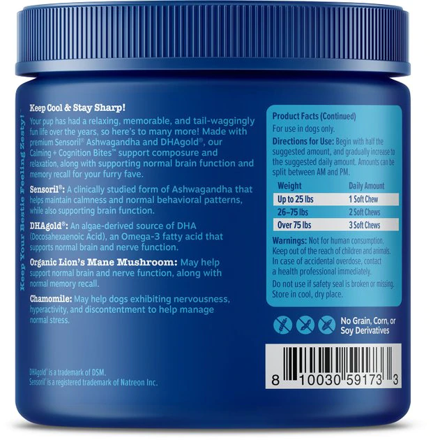 - A chewable supplement that supports cognitive function, memory recall, and normal stress for your canine.
