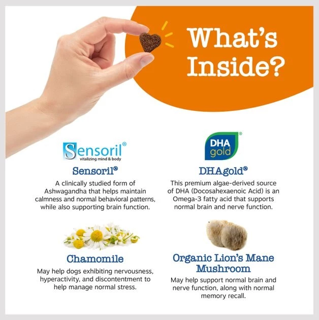 - These chicken flavored chews also include Sensoril, a clinically studied form of Ashwagandha that can help your pet cope with external stressors.