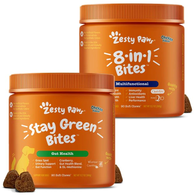 This multifunctional bundle will keep your dog’s tummy in tip top shape, and your lawn looking fresh. The Zesty Paws Grass Defense Stay Green Bites Digestive & Immune Health + 8-in-1 Multivitamin Bites Chicken Flavor Dog Supplement bundle provides you with two soft chew options for gut health support, which can be used separately or in tandem. The Stay Green Bites provide your dog with a powerful blend of cranberry, probiotics and antioxidants that work to support his urinary tract and gut health. The 8-in-1 Bites are provide eight great multifunctional benefits for your dog’s overall support. These functional supplements support health, function, and performance for adult and even senior dogs, small, medium, or large, and regardless of breed. Best of all, these doggie chewables taste delicious—so fido can get the support he needs without a struggle.