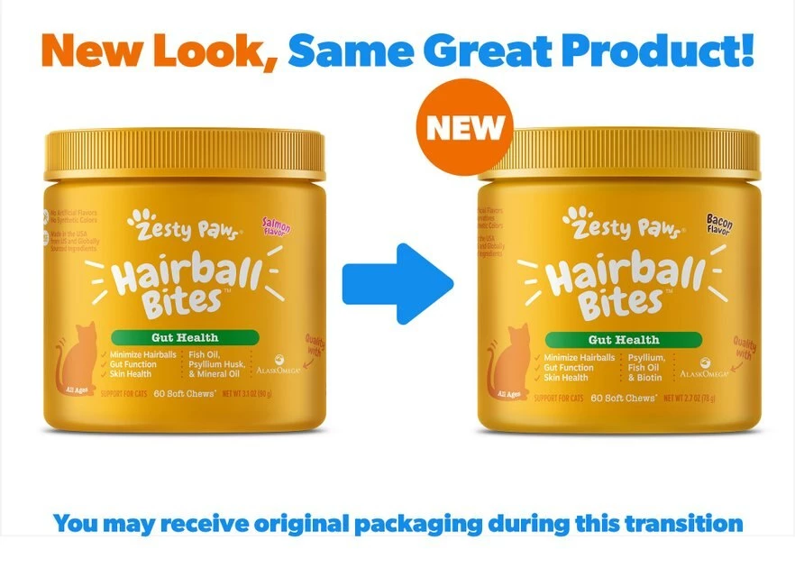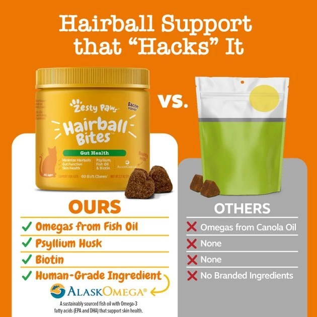 If hairballs have your frisky kitty feeling down, the Zesty Paws All Ages Hairball Bites Bacon Flavored Cat Supplement can help to get her feeling paw-some again. These bites contain omega-3 fatty acids from fish oil that help to minimize hairball formation while also supporting skin health. Psyllium husk supports kitty’s digestive function and bowel health while helping to eliminate hairballs. Zinc also helps to minimize hairball formation, while mineral oil helps to maintain normal skin moisture content so your best friend looks and feels great. These hairball bites are su-paw easy to feed and are free of corn, wheat, artificial flavors, artificial colors and other bad stuff.
