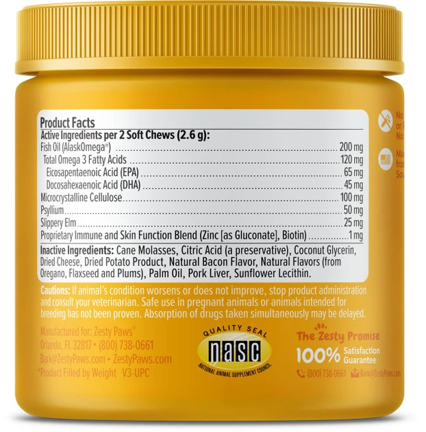 Fish Oil (AlaskOmega) 200 mg, Total Omega 3 Fatty Acids 120 mg, Eicosapentaenoic Acid (EPA) 65 mg, Docosahexaenoic Acid (DHA) 45 mg, Microcrystalline Cellulose 100 mg, Psyllium 50 mg, Slippery Elm 25 mg, Proprietary Immune and Skin Function Blend (Zinc [as Gluconate], Biotin) 1 mg, Cane Molasses, Citric Acid (a preservative), Coconut Glycerin, Dried Cheese, Dried Potato Product, Natural Bacon Flavor, Natural Flavors (from Oregano, Flaxseed and Plums), Palm Oil, Pork Liver, Sunflower Lecithin.