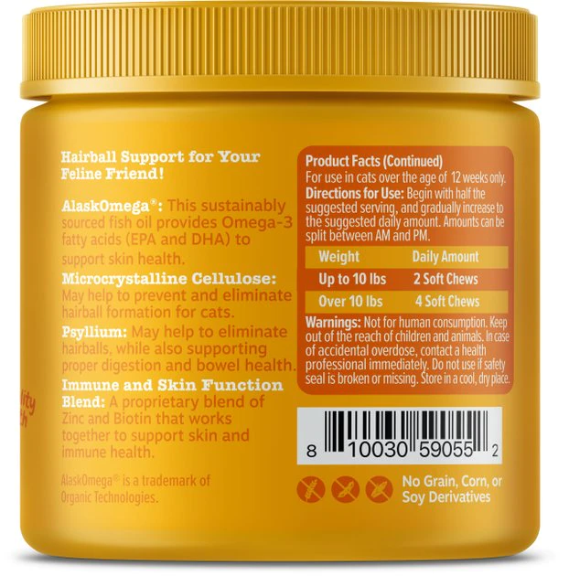 - Omega-3 fatty acids from fish oil, psyllium husk, zinc and mineral oil help to reduce hairball formation while promoting skin and digestive health.