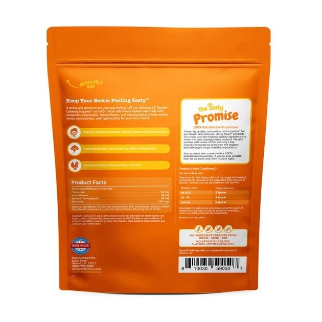 If everyday stress and tension have your pup feeling ruff, Zesty Paws delicious Lil’ Zesties Calming Squares can help! These soft chew squares are made with Melatonin, Chamomile, and Passionflower to help soothe stress, nervousness, and hyperactivity for your furry friend. Plus, this functional dog supplement features Sensoril, which is a premium form of Ashwagandha that provides support for clarity and relaxation. Plus, pets love the delicious taste that’ll give your canine companion an itch for more. Also, pet parents can treat themselves to a sigh of relief knowing that their pup has support in maintaining composure to keep them feeling too cool for thunderstorms, separation, everyday anxiety, fireworks, car rides, and other moments of normal stress.