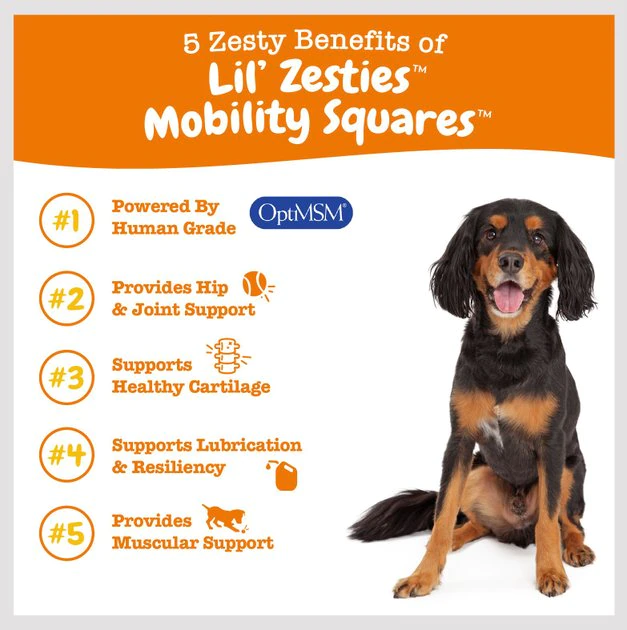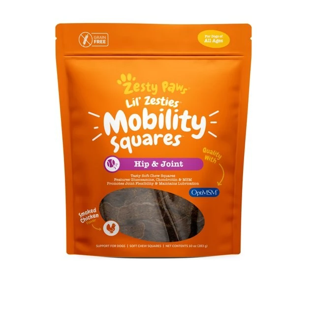 - Lil’ Zesties Mobility Squares are tasty grain free supplements that support hip, joint, and cartilage health to promote comfort and normal mobility for dogs.