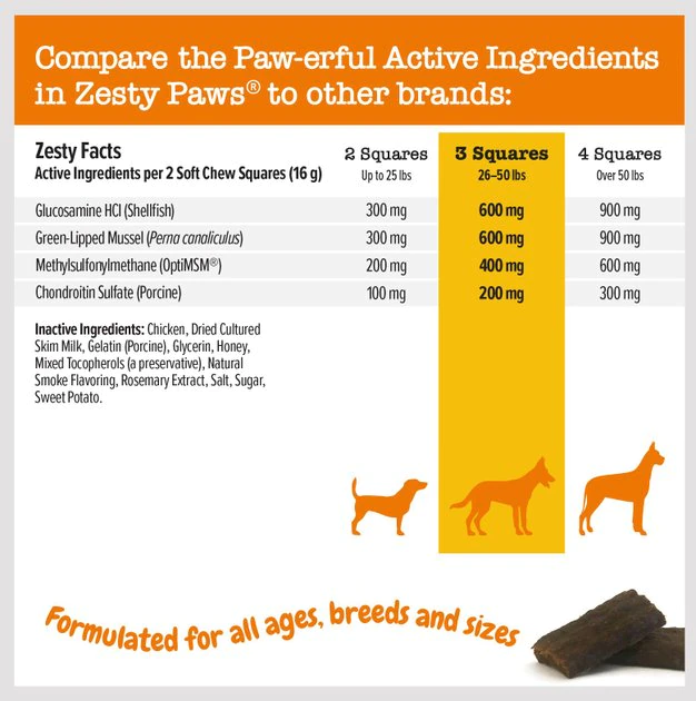Help your furry friend fetch with the best of them with Lil’ Zesties Mobility Squares! With a blend of Glucosamine, Chondroitin, Green-Lipped Mussel, and OptiMSM, a clinically studied form of MSM, these ingredients support hip, joint, and cartilage health to keep your pup feeling her bouncy best. This functional chewable dog supplement features OptiMSM, a form of MSM that provides premium muscular support, plus Glucosamine HCl and Chondroitin Sulfate to support hips, joints, connective tissue, and cartilage for dogs. Each chew of these functional supplements also includes Green Lipped Mussel for your canine pet.