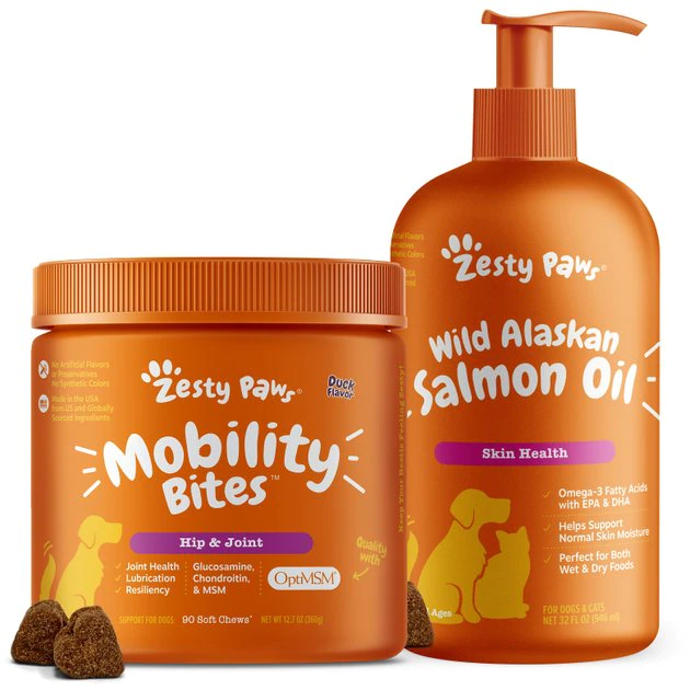 As a pet parent, you want to help your canine companion feel his best, both inside and out. The Zesty Paws Mobility Bites Hip and Joint Support Duck Flavor Dog Supplement, and Zesty Paws Pure Salmon Oil Skin and Coat Support Dog and Cat Supplement bundle works to do just that. Zesty Paws Mobility Bites Hip & Joint Support Chews for Dogs are tasty chews with a duck flavor, that are formulated with glucosamine chondroitin for joint mobility and other nourishing ingredients including vitamin E and flaxseed meal. Meanwhile, Zesty Paws Pure Salmon Oil Dog & Cat Supplement provides your dog with delicious liquid food supplement is packed with Omega-3 and -6 fatty acids that are great for your pet’s coat, joint function, immune system and heart health. Together, these products work to promote your dog’s overall health without having to go duck hunting or salmon fishing.