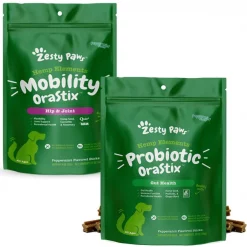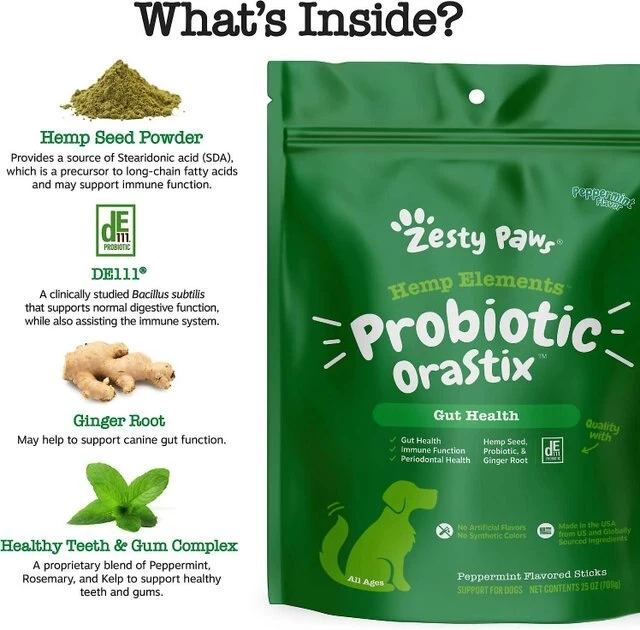 - Zesty Paws Probiotic OraStix are premium sticks with ingredients that support canine gut and immune system function, along with supporting their periodontal health.