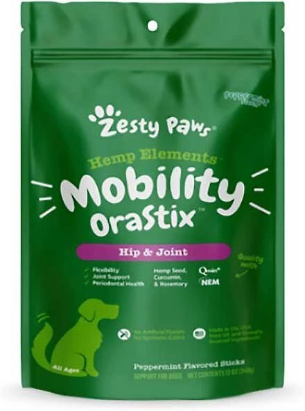 Get your pup’s teeth and body in great shape with Zesty Paws Mobility OraStix Mint Flavored + Probiotic OraStix Mint Flavored Dental Chews for Dogs! These hemp-enhanced sticks feature Hemp Seed Powder, Curcumin, Eggshell Membrane, and other pawsome ingredients that may support hip and joint health, while helping keep your dog’s teeth healthy and clean. Each stick features Hemp Seed, Qmin+ (Curcumin) and NEM (Eggshell Membrane) to provide advanced support for hips, joints, and cartilage. And these dental chews feature Hemp Seed Powder, DE111, and other ingredients that support gut function and help keep your companion’s chompers clean. They include a Healthy Teeth & Gum Proprietary Blend that includes Kelp, Peppermint Oil, and Rosemary Extract to support periodontal health for your doggy.