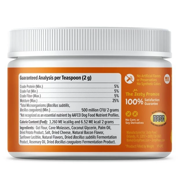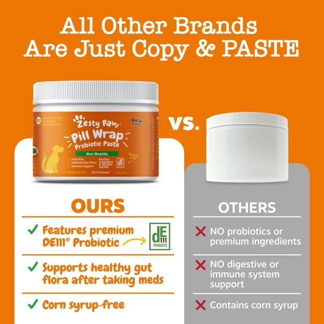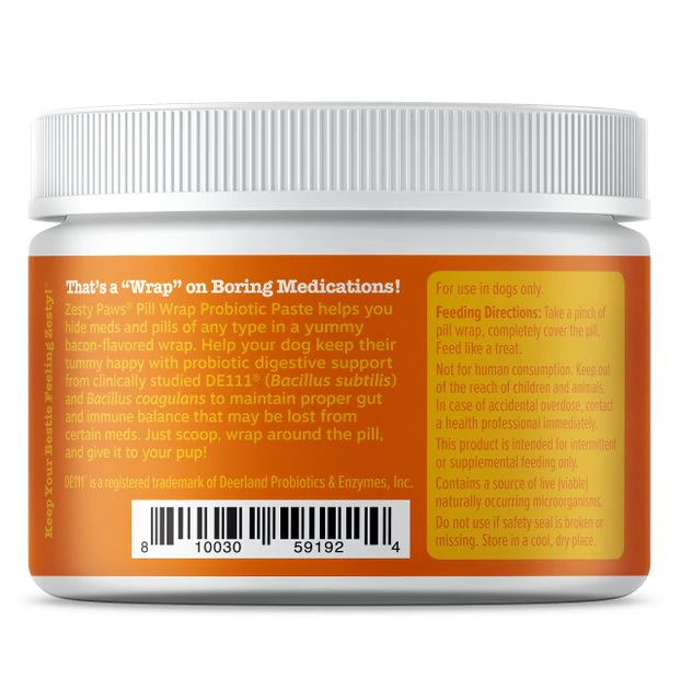 As a loving pet parent, you know your doggie doesn’t exactly love taking her pills, tablets, and capsules. But, Zesty Paws Probiotic Paste Bacon Flavor Immune & Digestive System Support Dog Supplement was created to give pet parents a confidence booster when it’s pill time! This Pill Wrap Probiotic Paste helps you hide meds and pills of any type or size in a yummy bacon-flavored wrap. Help your dog keep her tummy happy with probiotic digestive support from clinically studied DE111 (Bacillus subtilis) and Bacillus coagulans to maintain proper gut and immune balance that may be lost from certain meds. Just scoop, wrap around the pill, and give it to your pup!