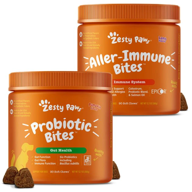 Keep your beloved pup happy and healthy during all seasons with our Zesty Paws Probiotic Bites Digestion + Aller-Immune Bites Lamb Flavor Immune System Soft Chews Dog Supplement bundle. Maintain her clockwork regularity with the probiotic chews, formulated to promote digestive relief and a healthy immune system in dogs of all ages. This special anti-gas and anti-diarrhea formula features pumpkin to relieve indigestion, leaky gut and overall discomfort, while papaya provides a source of papain to help her tummy break down proteins and fats. The Aller-Immune soft chew formula provides seasonal allergy support, along with supporting the immune system, skin health, and normal gut flora for canine pets, no matter the breed and for all ages. Both delicious flavors mean Fido will be itching for more, so you can both feel some big relief.