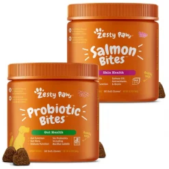 Keep your beloved pup happy, healthy and looking her best with this Zesty Paws combo pack! The pumpkin-flavored, Probiotic promote digestive relief and a healthy immune system in dogs of all ages. Each chew contains a six-strain blend of three billion colony forming units (CFUs) of probiotic and prebiotic bacteria to help her body break down essential nutrients that combat gas, bloating and constipation. This special anti-gas and anti-diarrhea formula features pumpkin to relieve indigestion, leaky gut and overall discomfort, while papaya provides a source of papain to help her tummy break down proteins and fats.The Salmon Bites are loaded with salmon meal and wild Alaskan salmon oil to deliver superior omega-3 and 6 EPA fatty acids that support a brilliant coat, strong immunity and a healthy heart. DHAgold, an essential DHA fatty acid, is included to provide extra nourishment for her skin and coat, while also strengthening brain and cardiovascular health. In addition, Biotin–a powerful B-complex vitamin–works with the salmon oil to revitalize dry, itchy skin and restore shine to dull, brittle coats. Both products are formulated with the finest-quality ingredients and are made in the USA in an FDA-registered, Good Manufacturing Practice (GMP)-certified facility.