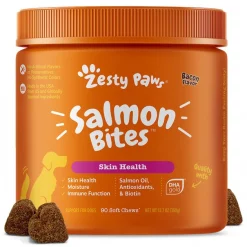 To maintain your pup’s skin health, Zesty Paws Salmon Bites can help you show your furry friend you care. With omega-3s and the antioxidants in vitamins C and E, these soft chews are functional supplements that support skin health and provide free radical protection to keep your dog feeling happy. They’re great for small, medium, and large dogs of all ages and breeds! Each chewable features DHAgold, an algae-derived source of DHA, an omega-3 fatty acid that supports skin and heart health. Plus, this functional supplement also includes salmon fish oil, biotin (or vitamin B7), and an antioxidant blend that includes vitamin C and vitamin E. Together, these ingredients help maintain the skin’s normal moisture content, reduce oxidative stress, and support immune function. Best of all, pets love the delicious taste! Also, pet moms and dads can let out a sigh of relief knowing that their pups will get the support they need with these simple, mess-free Salmon Bites that won’t coat your floors with oil!