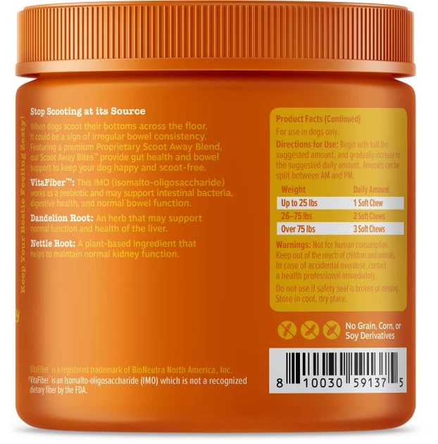 - The VitaFiber, Mineral Oil, and Scoot Away Blend in this chewable helps digestion and normal bowel function to stop pet parents from worrying about scooting to put them at ease.