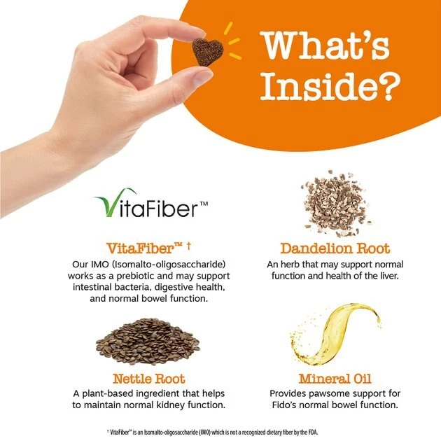 - This dog formula has VitaFiber, an IMO (Isomalto-oligosaccharide) which works as a prebiotic and may support intestinal bacteria, digestive health, and normal bowel function.