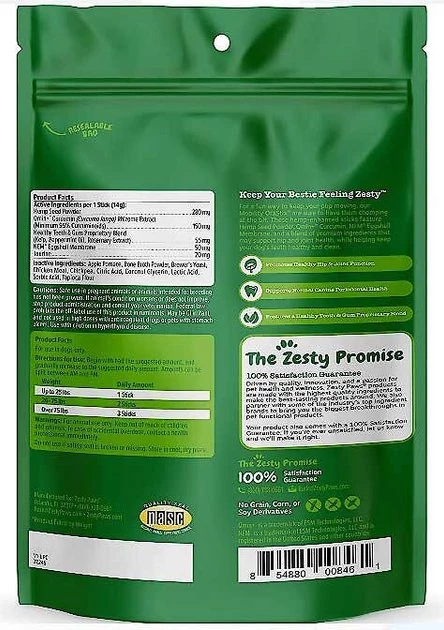 Treat your canine companion to this paw-fect bundle of Zesty Paws Senior, Advanced Mobility Bites, Chicken Flavored Soft Chews, Hip & Joint Functional Dog Supplement + Hemp Elements Mobility Orastix Dog Supplement. The joint supplement chewables are specifically designed to provide hip and joint support for your older pooch. The paw-erful formula includes ingredients like OptiMSM, a purified and distilled supplement that helps provide support to your pal’s muscles, Qmin+ Curucumin and a black pepper extract—all of which are formulated to work together to support your older buddy’s joints. Plus, combined with a blend of ingredients curcumin, bone broth and taurine, the mobility support chews are designed to help reduce inflammation, stiffness and discomfort to keep your pup active. Each delicious stick provides a source of chondroitin, hyaluronic acid and collagen to support cartilage health.