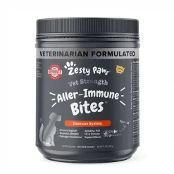 Zesty Paws Aller-Immune Bites Dog Vitamins are vet-formulated soft chews made with a high concentration of ingredients that help support your pet’s immune system and more! These soft chews feature three clinically studied branded ingredients, which are EpiCor, DE111 (Bacillus subtilis), and AlaskOmega Fish Oil. Plus, these supplements also include antioxidants from Spirulina, a stunning 500 mg (per chew) of Colostrum, and a Proprietary Immune Support Blend with Astragalus Root, Quercetin Dihydrate, Vitamin C (Ascorbic Acid), L-Arginine, and Bromelain. Together, this paw-erful collection of ingredients support immune function, seasonal allergies, normal respiratory function, digestion, skin health, and pathogen resistance to help the body’s immune response eliminate those yucky microorganisms! And since these bites have a wag-worthy smoked cheese flavor, your furry friend will love eating them! Say “goodbye” to bulky pills and tablets and “hello” to these whisker-licking soft chew dog vitamins! With Vet Strength Aller-Immune Bites, you can enjoy even more fun and fond memories that your pup’s itching to give!