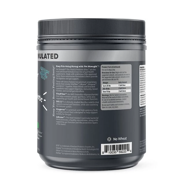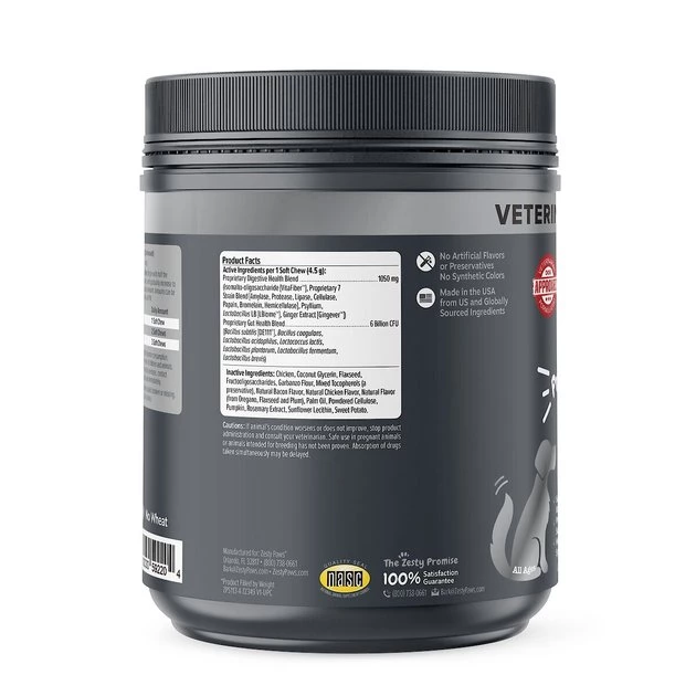 Zesty Paws Vet Strength Chicken & Harvest Vegetable Flavored Dog Vitamins are a veterinarian formulated soft chews that have a delicious flavor that dogs love! They provide full digestive and gut support and feature two premium proprietary blends that include VitaFiber, LBiome, Gingever, and DE111. These blends of probiotics, enzymes, and branded ingredients help support digestion, immunity, bowel function, and normal gut microflora. The path to a happy tummy starts with VitaFiber—an IMO (isomalto-oligosaccharide) that helps maintain proper gut flora, while also supporting gut health and normal bowel function.Then, your furry friend’s gut health journey wags on with DE111—a clinically studied Bacillus subtilis that supports normal gut function, while also assisting the immune system. This supplement also contains Gingever—a premium and high-potency form of ginger extract that is designed to help support motility for the gut. And the tummy health adventure ends with LBiome—a heat-treated inanimate bacterial strain that promotes a healthy microbiome, along with supporting gut function and the protective layers of the bowel.